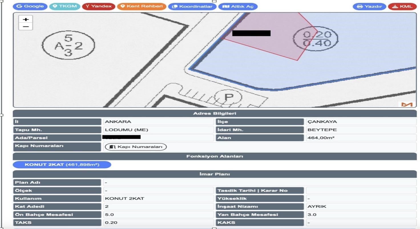 3- Ardından gelen ekran ile imar durumunu öğrenmek istediğiniz yerin imar durumu, alanı, emsali ve inşaat nizamı hakkında detaylı bilgiye erişebilirsiniz.