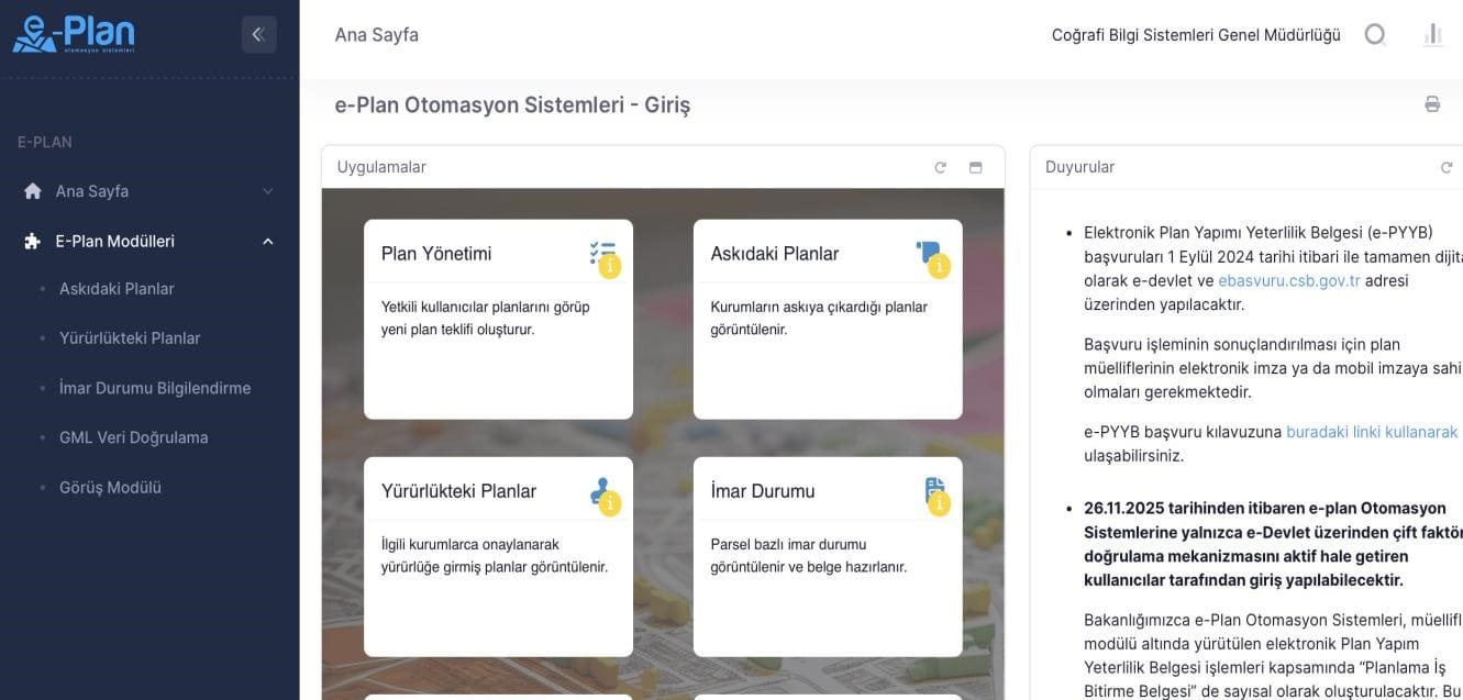 Çevre, Şehircilik ve İklim Değişikliği Bakanlığı tarafından hayata geçirilen E-Plan Sistemi, imar planlarına ilişkin bilgilerin dijital ortamda şeffaf ve erişilebilir şekilde sunulmasını amaçlayan resmi bir sorgulama platformudur.